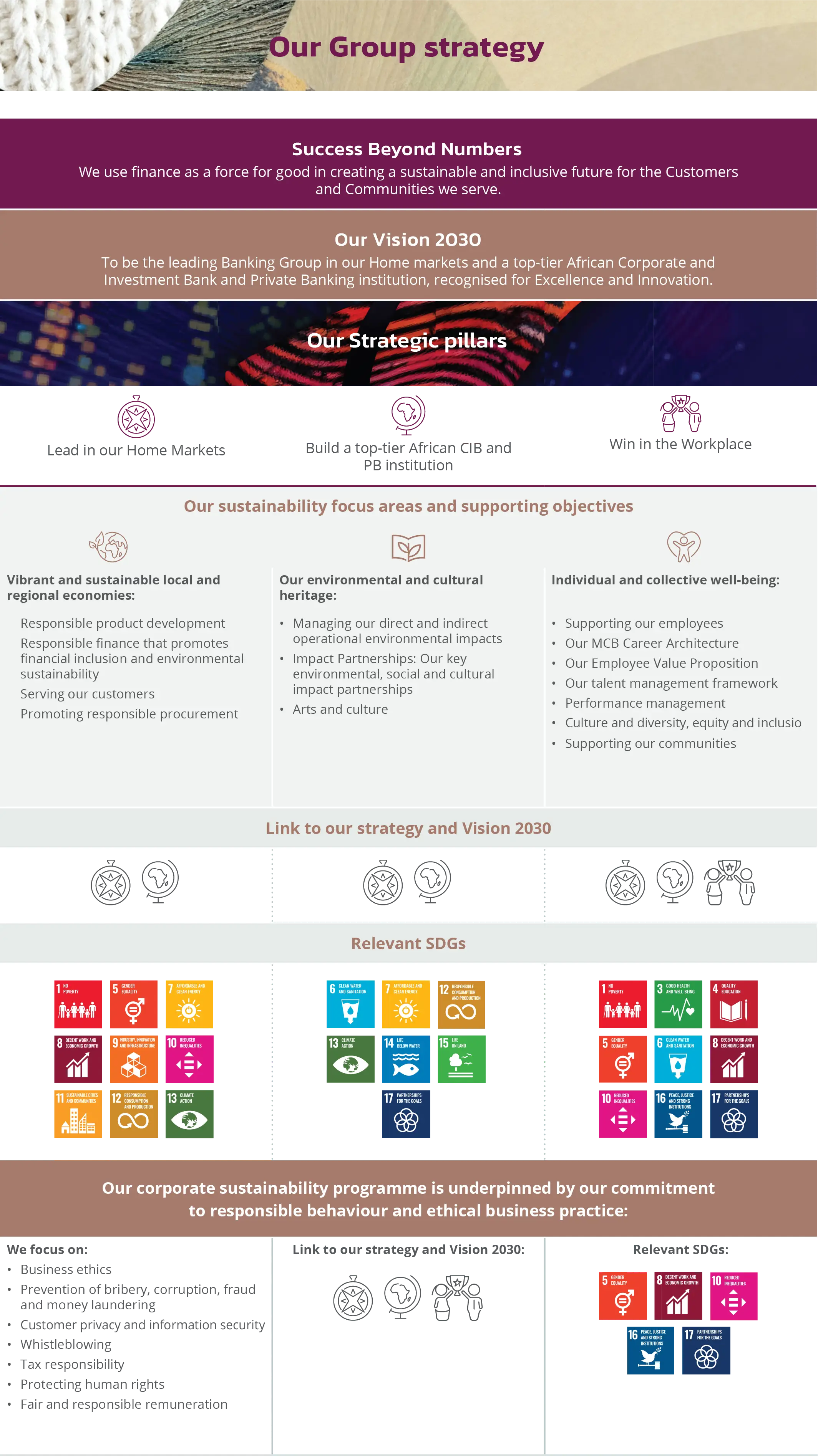 Our sustainability programme is anchored in our purpose, Success Beyond Numbers, and underpins our commitment to embed sustainability into all we do and shape every action into an opportunity to contribute to success and support the execution of the Group's strategy. The performance summary of our sustainability programme, structured around our sustainability focus areas band overarching commitment to responsible behaviour, is provided below.